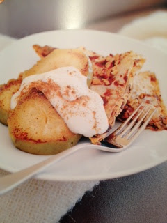Heat the unmelted butter in a large skillet, add the apples and spices, and cook over medium heat for 5 minutes, turning the apples once, until they are soft and golden. Serve accompanied with the phyllo triangles and a spoonful of Neufchatel. Dust with nutmeg.