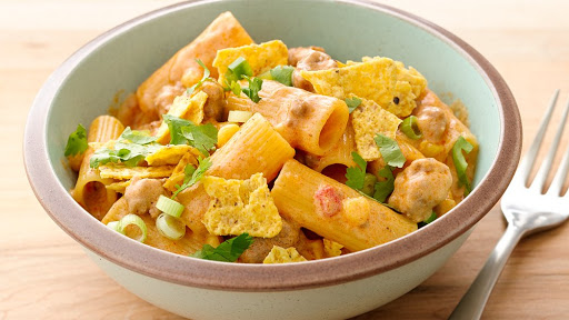 Add enchilada sauce, evaporated milk, 4 cups hot water, the pasta and corn. Heat to boiling over high heat. Reduce heat; simmer uncovered 15 minutes, stirring occasionally.