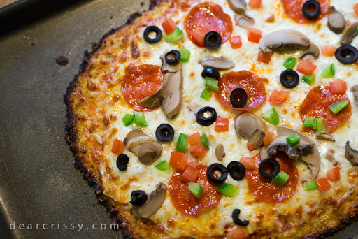 In a medium bowl, combine 1 cup riced, cooked cauliflower, 1 egg and your cheese. Next, add Italian seasonings, crushed garlic and salt. Making sure everything is well mixed, place your "dough" on the cookie sheet and pat out a 9" round. Be sure not to press it too thin as it's easy to create holes.