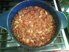 1 Pre-heat over at 350 F if using the Dutch-Oven method. 2 Brown ground beef, bacon, and onion together; drain. 3 Pour into Dutch Over or Crockpot. 4 Add beans and mix well. 5 Mix sugars, bbq sauce, molasses, and spices together; add to meat and beans. 6 Mix well. 7 Cook for 1 hour in oven if using Dutch-oven. 8 Cook on low for at least 3 hours if using a Crockpot.