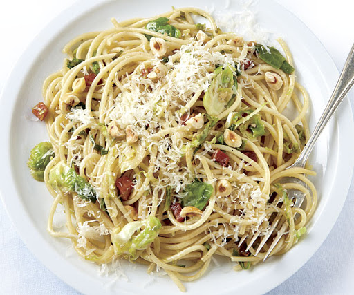 Spaghetti with Brussels Sprouts, Pancetta, and Hazelnuts