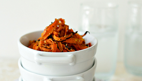 Use a vegetable peeler and peel two carrots into a large bowl. Toss carrot peels with olive oil and contents of seasoning mix packet.