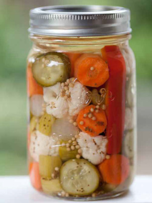 Combine 3 cups white vinegar, 1 1/2 cups water, 3/4 cup sugar, 3 Tablespoons pickling spice, 1 Tablespoon peppercorns, and 2 teaspoons salt. Bring to a boil, then simmer 5 minutes. Remove from heat; add 1 jalapeno and 4 dill springs. Pour over your favorite veggies or fruit, and refrigerate for at least an hour.