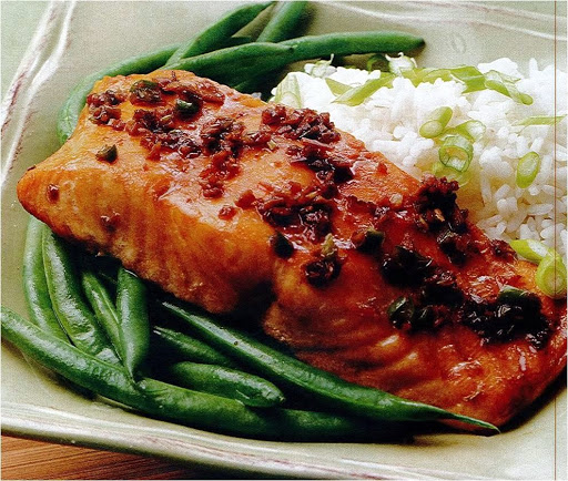 In a medium sauté pan over medium heat, warm the olive oil. Sauté the ginger, scallions and chiles until browned, about 1 to 2 minutes. Add the soy sauce, and cook until combined, about 1 minute. Spoon the ginger-scallion mixture over the salmon, and pour any remaining soy sauce over fgh. Bake, uncovered, until salmon flakes easily, about 25 to 30 minutes.