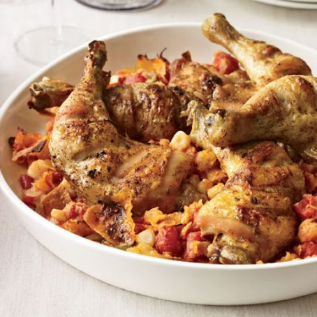 Chilaquiles is a baked Mexican dish that's often made with leftover shredded chicken, tortilla strips and cheese. In her more substantial and refined version, Grace Parisi bakes whole chicken legs with tomatoes, hominy, jalapeños and tortilla chips.