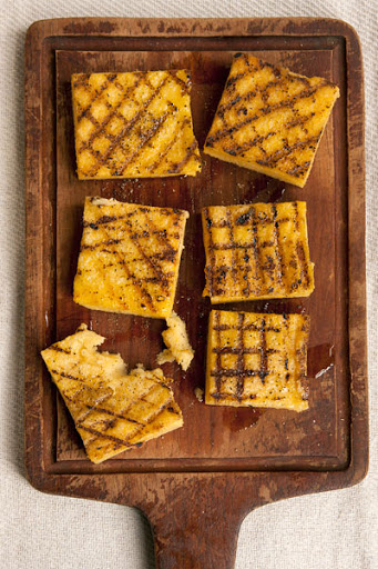 2. Pour into a wet ceramic or glass mold, cool, turn out, and cut into pieces with a wet knife. Grill on a very hot, dry grill or sear in a nonstick skillet until golden brown.
