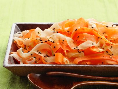 Toss the daikon and carrots with the dressing and season with salt. Top with the remaining sesame seeds.