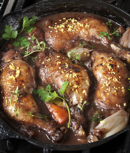 Preheat the oven to 425°F/220°C. Place the chicken legs on a large baking sheet and roast for 20 minutes. Remove from the oven and reduce the heat to 325°F/165°C.
