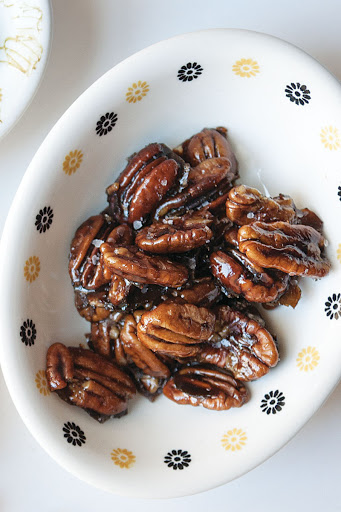 Spread pecan halves on a parchment paper-lined baking sheet. Bake until lightly toasted and fragrant, about 10 minutes; set aside. Boil brown sugar, balsamic vinegar, and olive oil in a 12" skillet over medium-high heat. Cook until mixture is foamy and slightly thickened, 2–3 minutes.