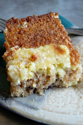 There are two layers to this cake. The bottom part is the cake and the top is cheesecake. In this picture you can see both. Around the edges it looks like cake but under the little bit of crust it really is cheesecake.