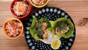 To serve, place some Lamb on a Lettuce Leaf. Top with choice of Kimchi, Cilantro and Lime.