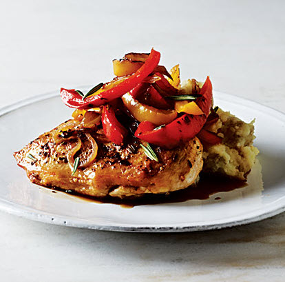 3. Heat remaining olive oil over medium-high heat. Add bell peppers, shallots, and rosemary; sauté 3 minutes. Stir in broth, scraping pan to loosen browned bits. Reduce heat; simmer 5 minutes. Increase heat to medium-high. Stir in vinegar, 1/4 teaspoon salt, and 1/4 teaspoon pepper; cook 3 minutes, stirring frequently. Serve bell pepper mixture over chicken.