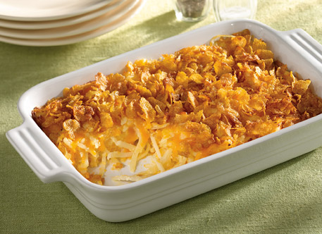Hash browns baked with cream of chicken soup, sour cream and cheese is a popular potluck casserole.