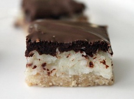 4. Melt the chocolate over a double boiler. Stir until melted and smooth. Pour over cooked coconut bars and spread into an even layer. Allow to cool then refrigerate until hardened, about 1 hour. Cut into 36 squares.