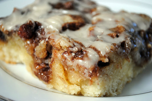 3. Bake at 350 degrees for 25-30 minutes or until toothpick comes out nearly clean from center. You want to make sure it’s done. I like most things underdone but cake is not one of them.4 4. Place powdered sugar, milk and vanilla in a large bowl. Whisk until smooth. Drizzle over warm cake. Serve warm or at room temperature.