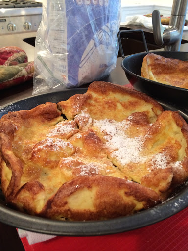Use two round oven proof baking pans. (I used my Le Cruset cast iron skillet, you could also use a pie dish.) Melt 3T of butter in each pan in the oven as the pre-heats to 425-450 degrees. When the butter is melted and oven is pre-heated, pour 1/2 of the batter into each pan and bake for 10-15 minutes. The pancake will puff up on the sides and become golden in the center when done!