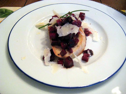 Grill bread and top with the beet mixture and grate cheese over each piece.