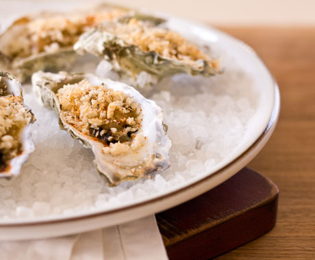 Heat a pan of ice cream salt in a 400-degree oven for 15 minutes. Place the oysters on the half shell in the hot ice cream salt and return to the oven for about 5 minutes. Spoon the sauce over each oyster and sprinkle with a mixture of the bread crumbs and cheese. Return to the oven and bake until the bread crumb mixture is lightly browned. Two dozen oysters served this way will serve four.