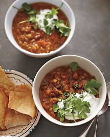 Top with yogurt, cilantro sprigs, and sliced chiles, and serve with pita chips.