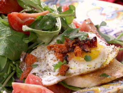Argentina Rocket Salad with Fried Egg, Grilled Chorizo and Grilled Provoleto Crostini
