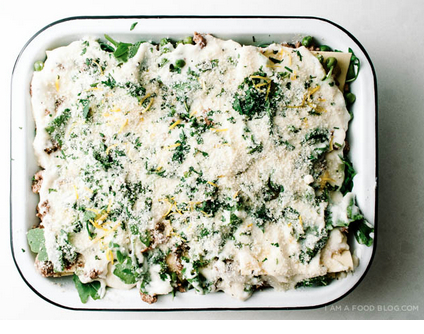 Assemble your lasagna: In an oven-proof casserole dish (I used a 13 x 11 inch), spread out a generous amount of the lamb mixture, top with a layer of no-bake lasagaa noodles (break the noodles to fit if needed), then cheese sauce. Sprinkle with flat leaf parsley, mint, arugula and lemon zest. Repeat until you have used up all of the noodles, sauce and cheese, ending with a cheese layer. Sprinkle on a bit of parmesan and bake, covered tightly with tinfoil for 40 minutes, then uncovered at 375°F for 15 minutes. Let stand for 5-10 minutes and enjoy!