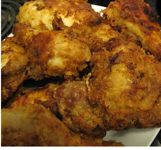 About 1 hour before serving, heat oil in heavy saucepan 9-inches in diameter with depth of oil about 3-inches to a temperature of 425 degrees. Put milk in deep narrow bowl and dip each piece chicken in the liquid, letting excess drip off. Dust lightly but evenly in the pancake flour. DO NOT OVERCOAT!!! Dry pieces a few minutes without letting them touch each other on wire rack. Fry a few pieces at a time for 5-6 minutes each. Place on sprayed cookie sheet without letting them touch each other and bake uncovered in a 350 oven for 30 minutes.