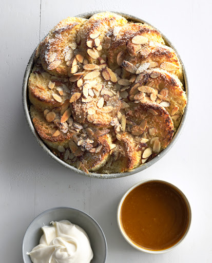 Pour custard evenly over bread. Sprinkle with almonds and raw sugar.