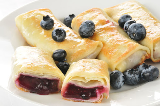 Use a slotted spoon to put 1-2 tablespoons of berry mixture (leaving sauce to drizzle over the top) on the lower third of the blintz. Fold the bottom up and over the filling, tuck in both sides (like a burrito) as you go and roll towards the top of the blintzes. You should end with the seam side down. Repeat with rest of blintzes.