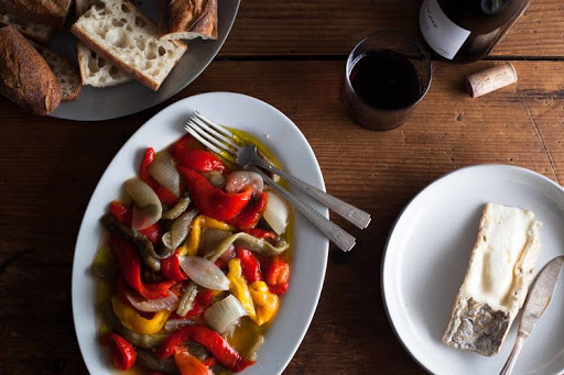 I first tried this in Barcelona, pulled out of my host's fridge in a glass baking dish like it was no big thing: roasted peppers and onions and eggplant, swimming in oil, brightened with sherry vinegar. It's like the Catalan answer to ratatouille, and is beautiful on bread. It's also often served with meat and fish dishes.