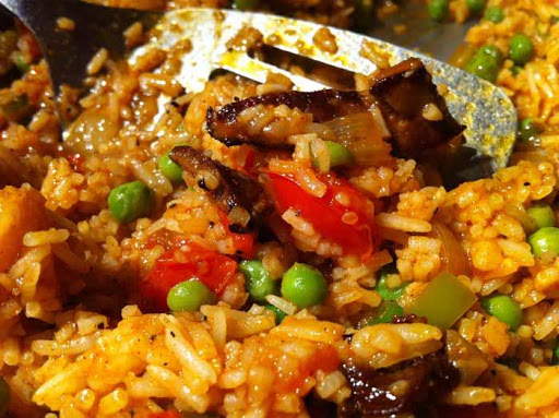 4. Add the tomatoes, peas and cooked rice and bring to a simmer and allow to cook until thickened