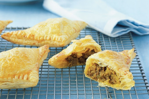 Cut each sheet of pastry into 4 squares. Spoon filling into centre of each square. Fold each square in half on the diagonal to form a triangle. Use a fork to press pastry edges together to seal. Place onto prepared tray. Brush with egg. Bake for 18 to 20 minutes or until golden. Serve with green salad.
