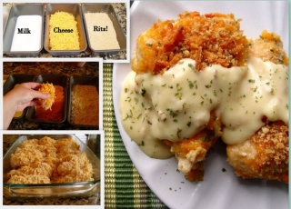 4. Dip each piece of chicken into the eggs then the cheese (pat the cheese to adhere)and finally the cracker crumbs.