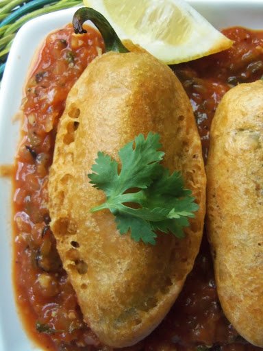5. Take one jalapeno at a time and carefully cut a T shape towards the top of pepper, but do not disturb the stem. With the small knife, gently cut the seeds and membranes, pull them out with your fingers. Fill each pepper carefully with cheese mixture; do not overstuff. Dredge in flour, and if oil is hot enough, holding on to the stem, dip into beer batter, using a small spoon to help you coat it evenly. Transfer to hot oil and cook for about 1 minute on each side or until golden brown in color. Transfer to a plate lined with paper towels. Serve with warm tomato jam, garnish with lemon wedges and cilantro. Serves 4 as an appetizer.