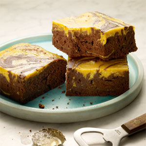 3. Scrape half the chocolate batter into the prepared baking pan and spread evenly. Spread half the pumpkin mixture on top, then add the remaining chocolate mixture on top of that and spread evenly. Top with the remaining pumpkin mixture. Gently swirl batter with a butter knife. Bake for about 30 minutes, or until an inserted toothpick comes out clean. Let cool before slicing.