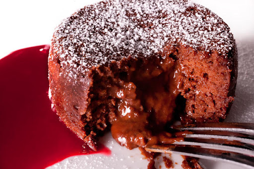 Alternate folding the whipped egg whites and flour, in three additions, into the chocolate mixture until just combined (a few remaining streaks are OK; do not overmix). Divide the batter among the ramekins (each about three-fourths full) and place them on a baking sheet. Bake until the sides of the cakes have set and the tops are no longer wet but the very center (about 1 inch’s worth) still jiggles, about 10 to 12 minutes. Transfer the ramekins to a wire rack and cool for 5 minutes.