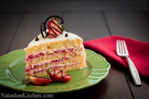 Spread the first layer with ⅓ of the strawberry puree. Spread a thin layer of frosting on the second half and place it over the first layer so the strawberries and cream are hugging. Repeat with the next layers. So the order from the bottom up is: cake; strawberry; cream; cake; strawberry; cream;cake; strawberries; cream; cake; cream (frost the top and sides with remaining frosting).
