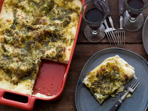 Butter a 13 by 9 by 4 baking dish and add a thin layer of besciamella (bechamel sauce). Cover with a layer of lasagna noodles, and then another thin layer of besciamella. Gently spread about 4 tablespoons pesto across the surface, and then top with about 2 tablespoons Parmesan. Repeat until you finish layering the lasagne. Top with a final layer of noodles and spread a final very thin layer besciamella, pesto, Parmesan cheese and a little butter to help the cheese crisp-up when cooked in the oven.