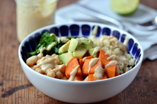 From Dreena Burton: A creamy, flavorful dressing made with a base of chickpeas and flavored with maple syrup and the smoky essence of chipotle! It’s so nourishing and wholesome, and every bite hits a little different flavor note that’s just so scrumptious! Also, it’s a substantial dressing with a fairly thick texture, which ‘clings’ nicely to salad ingredients. For the photo we used sweet potatoes and avocado with the kale and quinoa, and I’ll tell you this combination with the dressing makes a pretty wicked lunch bowl!