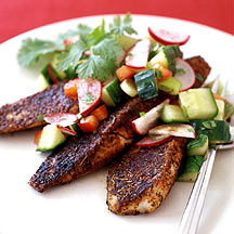 Combine cucumber, radishes, red pepper, scallions, cilantro, lime juice and olive oil in a medium bowl. Season to taste with salt and pepper and serve on top of fish. Yields about five ounces fish and a scant 1/2 cup of salsa per serving.