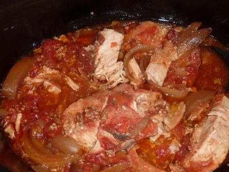 Put all ingredients in a crock pot. Cook on low heat for 6-8 hours. Serve over spaghetti squash or other favorite side.