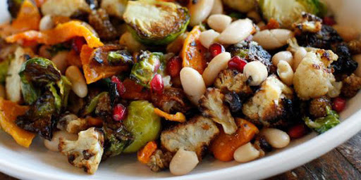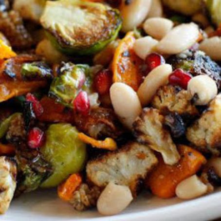 Roast the squash and Brussels sprouts using the same technique as the cauliflower. Allow the vegetables to cool to room temperature, then combine them in a large bowl with the beans and dried fruits.