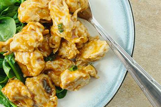 Combine all of the ingredients in a slow cooker. Cook on low heat for 3-4 hours until chicken is tender. Remove from the slow cooker, lay chicken out on a foil lined sheet pan and cover with the liquid from the crockpot. Broil for 4 minutes or until chicken is caramelized. Serve with your favorite vegetables.