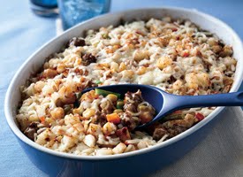 In baking dish, layer 3 cups of the potatoes and 1 cup of the cheese. Spoon ground beef mixture over cheese. Top with remaining potatoes. Cover with foil.