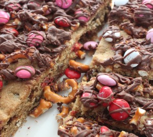 Spread the batter evenly in the pan. Press the batter down with a spatula. Bake for approximately 25 minutes, until golden brown. The middle might be a little gooey but that is ok, the bars will set up. Transfer the pan to a rack. In a bowl, melt chocolate chips in the microwave, stirring every 30 seconds until smooth. Sprinkle the bars with remaining pretzels and remaining M&M’s. Drizzle with melted chocolate. Let cool until set.