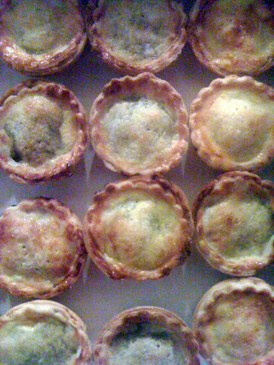 Cut first half into 12 thin circles for bases. Press into muffin pan. Spoon 2 tbspns mince meat into each.