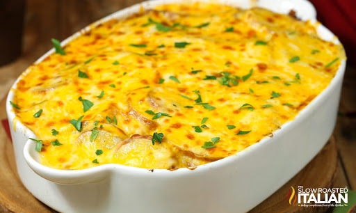 potato slices on top of the cheese. Add 1 cup of cheese sauce over the