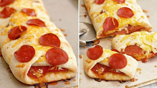 Starting from one end, fold strips of dough over the filling to the center, so the ends overlap and it looks braided. Sprinkle top with remaining cheese and a few more slices of pepperoni.