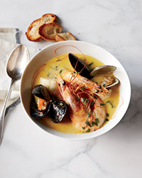 Using a slotted spoon, transfer the seafood to 4 serving bowls. Pour half of the broth into a large bowl and vigorously whisk in 1/2 cup of the aioli until smooth. Pour the aioli-enriched broth back into the pot and whisk once more. Pour the broth over the seafood in the serving bowls; garnish with the tarragon. Pass the remaining aioli at the table.