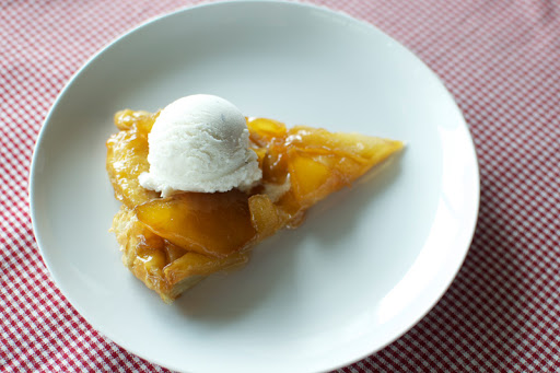 When tart is done, remove from oven and allow to cool for 30 minutes on a wire rack. Place a 12” to 14” flat serving platter, top side down, over the tart. Invert the tart onto the platter, being very careful of hot caramel. Allow the pan to sit upside down on the platter for a couple of minutes. Remove pan. Cut into wedges and serve warm.