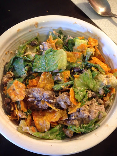 Now, on to the Doritos. This can go one of two ways. If you’re serving this for a crowd, I advise you to next, add about half the bag. This is done by crunching the chips in your hands as you pull them from the bag and put them in the salad bowl. Medium sized pieces seem to work best. Usually if I’m only cooking for Justin, I end up with a couple meals worth of leftovers, so I have him add the chips to his own bowl. This prevents the chips from having a chance to get soft before the next meal.